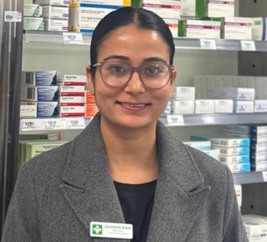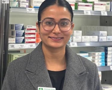 Jasmeet Kaur is a dedicated Intern Pharmacist with a Bachelor of Pharmacy and a Master’s in Forensic Science and Toxicology. Passionate about delivering patient-centred care, Jasmeet focuses on helping individuals feel confident and supported in managing their health.With expertise in medication counselling, vaccinations, and over-the-counter product recommendations, Jasmeet is committed to ensuring every healthcare experience is simple, safe, and stress-free.